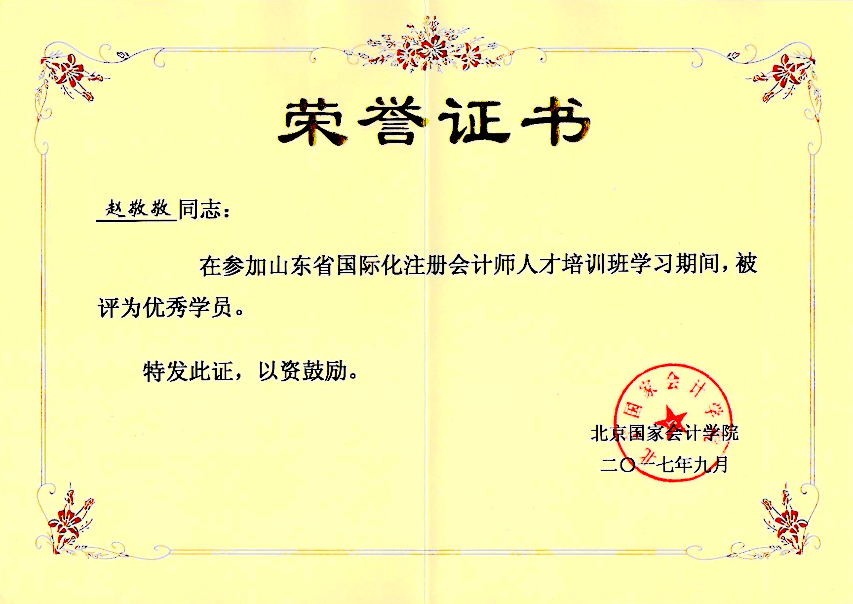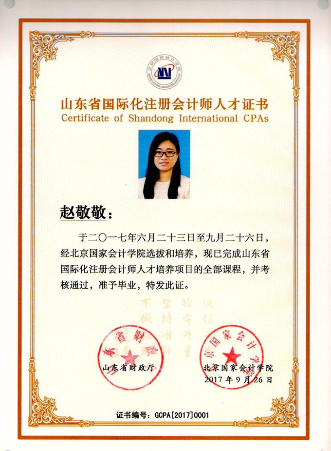 賀趙敬敬成為“山東省國際化注冊會計師人才”并獲得“優(yōu)秀學員”稱號。