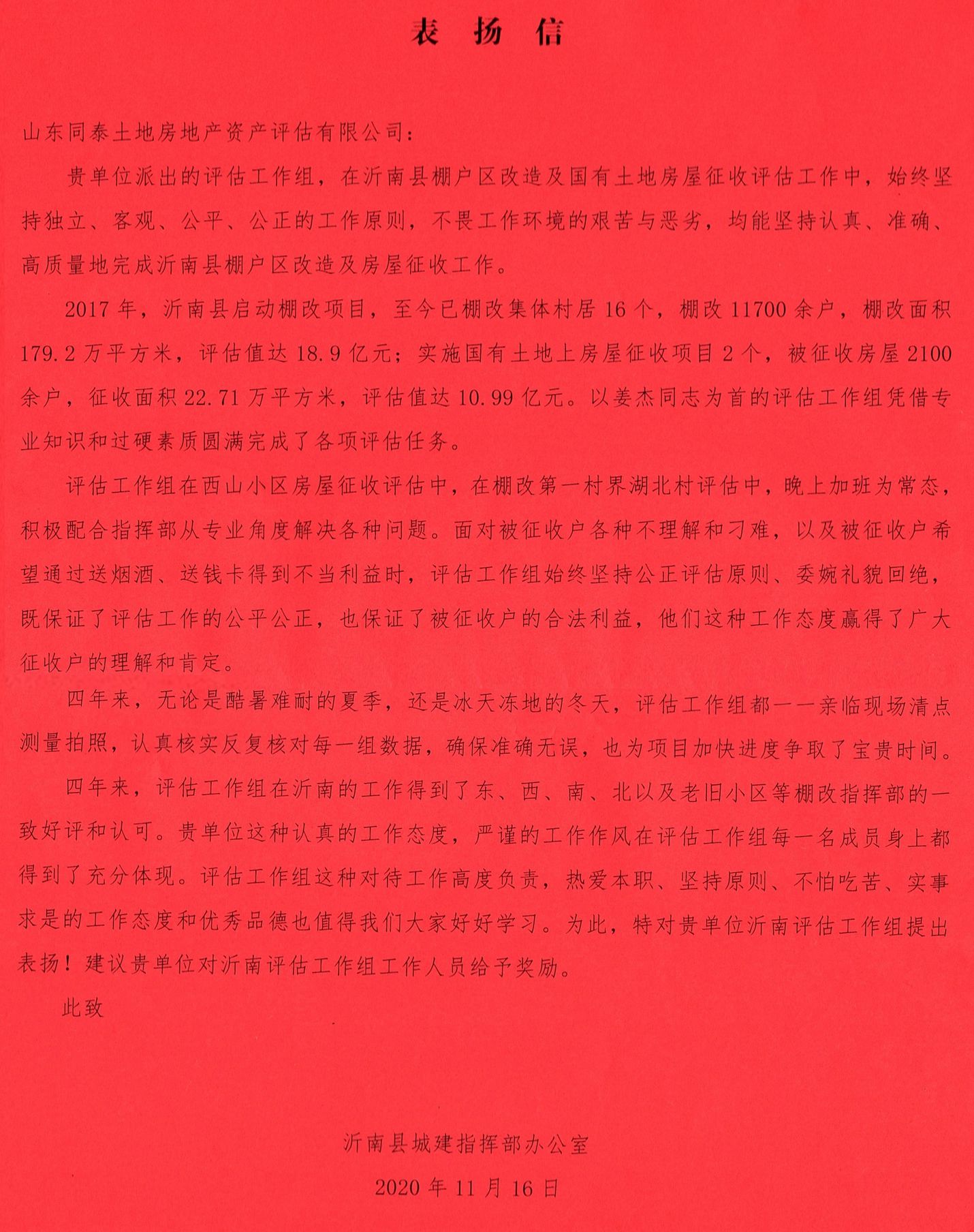 山東同泰土地房地產(chǎn)資產(chǎn)評(píng)估有限公司: 貴單位派出的評(píng)估工作組,在沂南縣棚戶區(qū)改造及國(guó)有土地房屋征收評(píng)估工作中,始終堅(jiān)持獨(dú)立、客觀、公平、公正的工作原則,不畏工作環(huán)境的艱苦與惡劣,均能堅(jiān)持認(rèn)真、準(zhǔn)確、高質(zhì)量地完成沂南縣棚戶區(qū)改造及房屋征收工作。2017年,沂南縣啟動(dòng)棚改項(xiàng)目,至今已棚改集體村居16個(gè),棚改11700余戶,棚改面積179.2萬(wàn)平方米,評(píng)估值達(dá)18.9億元;實(shí)施國(guó)有土地上房屋征收項(xiàng)目2個(gè),被征收房屋2100余戶,征收面積22.71萬(wàn)平方米,評(píng)估值達(dá)10.99億元。以姜杰同志為首的評(píng)估工作組憑借專業(yè)知識(shí)和過(guò)硬素質(zhì)圓滿完成了各項(xiàng)評(píng)估任務(wù)。 評(píng)估工作組在西山小區(qū)房屋征收評(píng)估中,在棚改第一村界湖北村評(píng)估中,晚上加班為常態(tài),積極配合指揮部從專業(yè)角度解決各種問(wèn)題。面對(duì)被征收戶各種不理解和刁難,以及被征收戶希望通過(guò)送煙酒、送錢卡得到不當(dāng)利益時(shí),評(píng)估工作組始終堅(jiān)持公正評(píng)估原則、委婉禮貌回絕,既保證了評(píng)估工作的公平公正,也保證了被征收戶的合法利益,他們這種工作態(tài)度贏得了廣大征收戶的理解和肯定。 四年來(lái),無(wú)論是酷暑難耐的夏季,還是冰天凍地的冬天,評(píng)估工作組都一一親臨現(xiàn)場(chǎng)清點(diǎn)測(cè)量拍照,認(rèn)真核實(shí)反復(fù)核對(duì)每一組數(shù)據(jù),確保準(zhǔn)確無(wú)誤,也為項(xiàng)目加快進(jìn)度爭(zhēng)取了寶貴時(shí)間。 四年來(lái),評(píng)估工作組在沂南的工作得到了東、西、南、北以及老舊小區(qū)等棚改指揮部的一致好評(píng)和認(rèn)可。貴單位這種認(rèn)真的工作態(tài)度,嚴(yán)謹(jǐn)?shù)墓ぷ髯黠L(fēng)在評(píng)估工作組每一名成員身上都得到了充分體現(xiàn)。評(píng)估工作組這種對(duì)待工作高度負(fù)責(zé),熱愛(ài)本職、堅(jiān)持原則、不怕吃苦、實(shí)事求是的工作態(tài)度和優(yōu)秀品德也值得我們大家好好學(xué)習(xí)。為此,特對(duì)貴單位沂南評(píng)估工作組提出表?yè)P(yáng)!建議貴單位對(duì)沂南評(píng)估工作組工作人員給予獎(jiǎng)勵(lì)。 此致 沂南縣城建指揮部辦公室 2020年11月16日