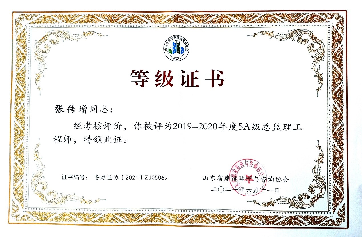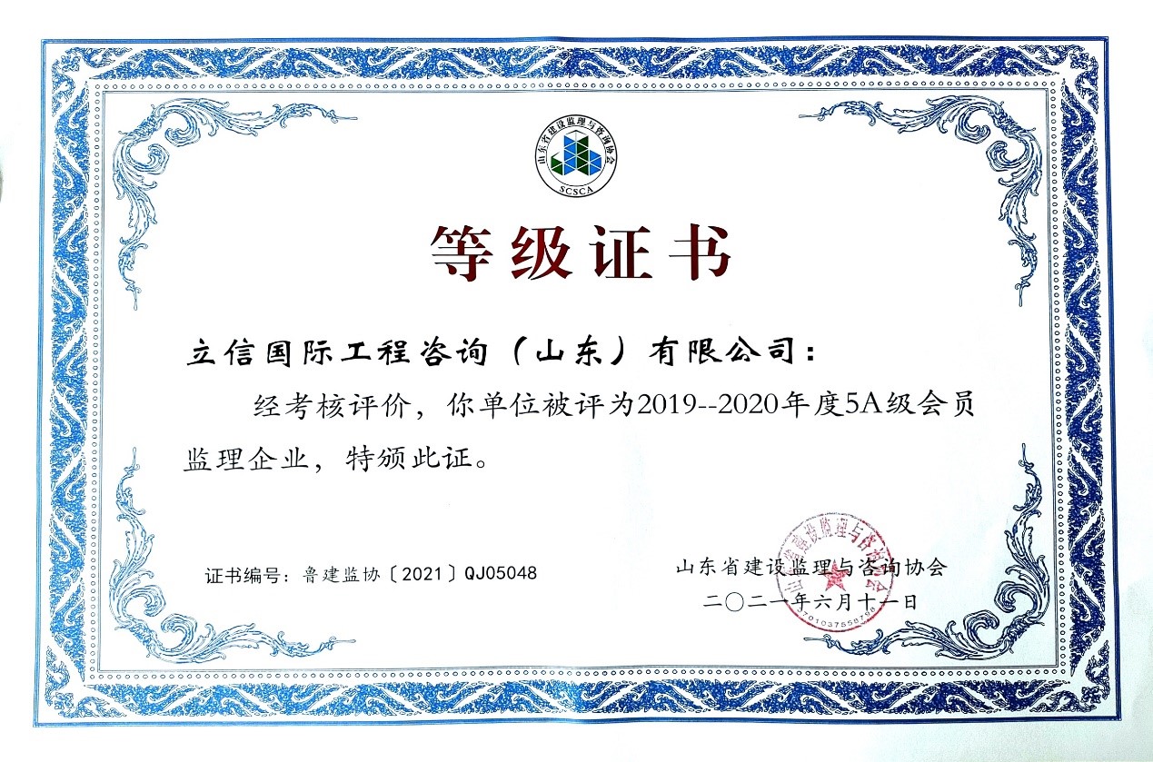 2021年6月,山東省建設(shè)監(jiān)理與咨詢協(xié)會、臨沂市建設(shè)監(jiān)理協(xié)會分別開展了有關(guān)全過程咨詢服務(wù)、監(jiān)理等業(yè)務(wù)的各項綜合考評,立信國際工程咨詢(山東)有限公司在考評中獲得較高信用等級。 在山東省建設(shè)監(jiān)理與咨詢協(xié)會開展的2019-2020年度全過程咨詢服務(wù)業(yè)務(wù)會員單位考核評價工作中,我公司被評選為山東省首批5A級會員監(jiān)理企業(yè)、5A級會員招標(biāo)代理機構(gòu)、4A級全過程工程咨詢服務(wù)會員單位。 我公司員工多人被山東省建設(shè)監(jiān)理與咨詢協(xié)會評選為2019-2020年度先進(jìn),其中,馬海嘯、張傳增被評為5A級總監(jiān)理工程師,高宏、張傳增被評為5A級招標(biāo)代理項目負(fù)責(zé)人,呂建建、彭紅運被評為4A級招標(biāo)代理項目負(fù)責(zé)人。