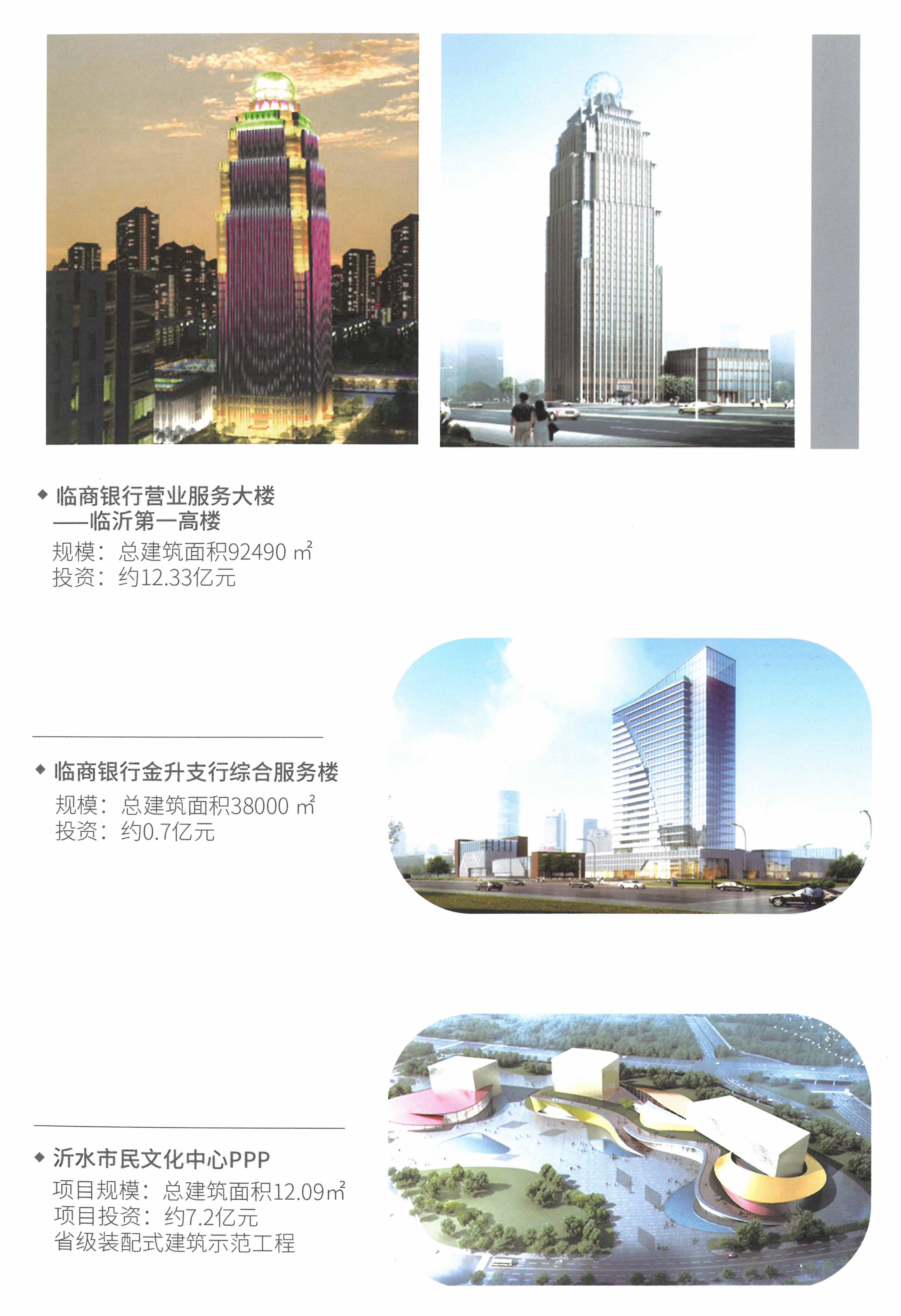 ·臨商銀行營業(yè)服務(wù)大樓 ·臨商銀行金升支行綜合服務(wù)樓 ·滕州市西崗鎮(zhèn)盛隆化工有限公司安全防護距離搬遷工程 ·沂水市民文化中心PPP