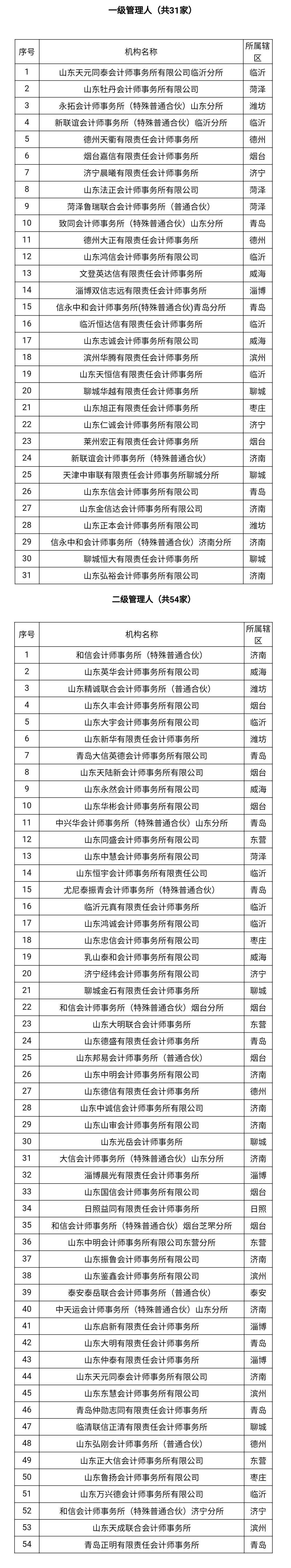 2月26日,山東省高級人民法院向社會公布了企業(yè)破產(chǎn)案件管理人初審名冊。初審名冊中的機(jī)構(gòu)管理人分為兩級,我省行業(yè)入冊機(jī)構(gòu)85家,其中一級管理人31家,二級管理人54家。自編制企業(yè)破產(chǎn)案件管理人名冊的通知下發(fā)以來,協(xié)會積極與山東省高院、地方中院及破產(chǎn)管理人協(xié)會等多方協(xié)調(diào),努力爭取注冊會計(jì)師行業(yè)話語權(quán),多種途徑宣傳并全力配合會計(jì)師事務(wù)所辦理申報入冊事項(xiàng)?,F(xiàn)將入冊會計(jì)師事務(wù)所名單列示如下(個人管理人略):