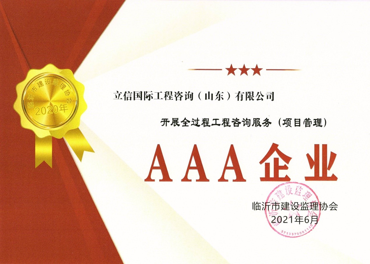 2021年6月,山東省建設(shè)監(jiān)理與咨詢協(xié)會、臨沂市建設(shè)監(jiān)理協(xié)會分別開展了有關(guān)全過程咨詢服務(wù)、監(jiān)理等業(yè)務(wù)的各項綜合考評,立信國際工程咨詢(山東)有限公司在考評中獲得較高信用等級。 在山東省建設(shè)監(jiān)理與咨詢協(xié)會開展的2019-2020年度全過程咨詢服務(wù)業(yè)務(wù)會員單位考核評價工作中,我公司被評選為山東省首批5A級會員監(jiān)理企業(yè)、5A級會員招標(biāo)代理機構(gòu)、4A級全過程工程咨詢服務(wù)會員單位。 我公司員工多人被山東省建設(shè)監(jiān)理與咨詢協(xié)會評選為2019-2020年度先進(jìn),其中,馬海嘯、張傳增被評為5A級總監(jiān)理工程師,高宏、張傳增被評為5A級招標(biāo)代理項目負(fù)責(zé)人,呂建建、彭紅運被評為4A級招標(biāo)代理項目負(fù)責(zé)人。